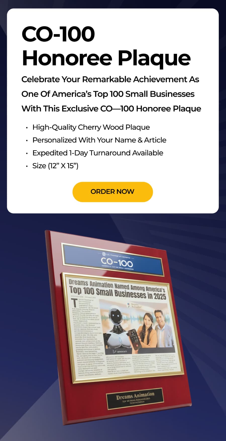 Celebrate your remarkable achievement as one of America’s Top 100 Small Businesses with this exclusive CO—100 Honoree Plaque
